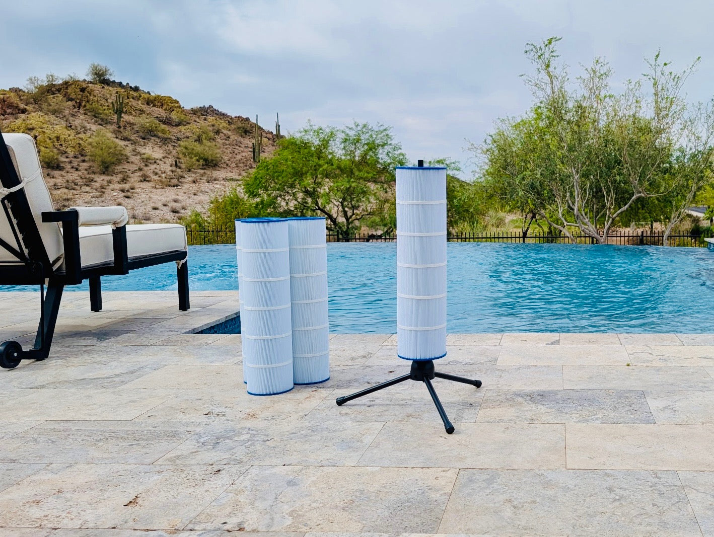 Our durable, foldable Pool Cartridge Cleaning Stand makes pool maintenance a breeze. Now featuring innovative Spin-Finity Endcaps, this pool cleaning tool provides hands-free, 360-degree pool filter cleaning, eliminating painful bending and keeping your workspace tidy. It's stable on uneven ground, compatible with major OEM brands like Jandy, Pentair, and Hayward, as well as popular aftermarket brands including Pleatco, Filbur, and Unicel, and built tough for daily use. Experience easy pool filter cleaning and a consistently crystal clear pool with our top-tier pool maintenance equipment.